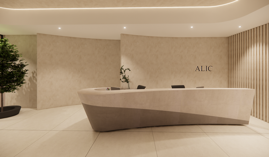 Minimalist and serene modern office facade. Smooth, light-colored stucco walls and a striking arched entryway, offering a soft, sculptural quality. A large, dark sliding glass door suggests an open, light-filled interior. The aesthetic is one of understated sophistication and tranquility